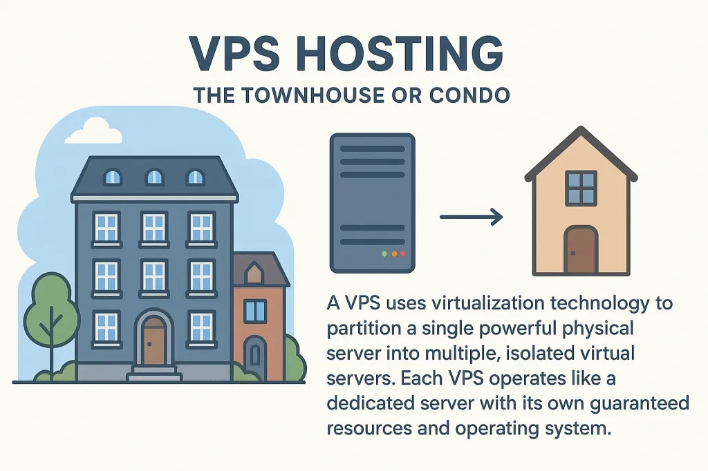 The Analogy: A Virtual Private Server (VPS) is like owning a townhouse or a condo. You're still part of a larger building (the physical server), but your unit is completely private. You have your own guaranteed utilities and space (dedicated RAM and CPU), and your neighbors' activities don't directly affect you. You have more control but also more responsibility.